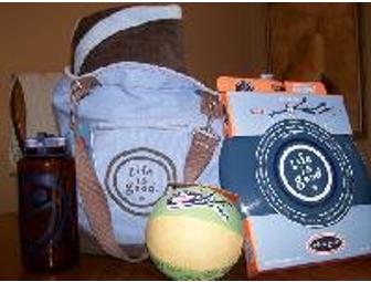 Life Is Good Beach Bag filled with items needed for a day at the beach (towel, water bottle, ball, frisbee)