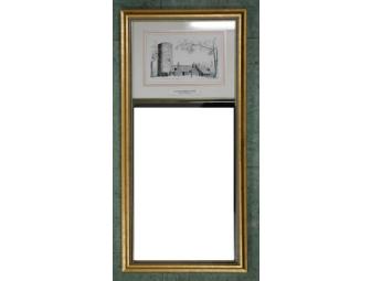 Find a special place for this beautiful pen and ink mirror which features a scene from Avon's campus. Illustrated in a style reminiscent of an Old English engraving, it is surrounded by a gold-tone wood frame and measures 12" x 25".