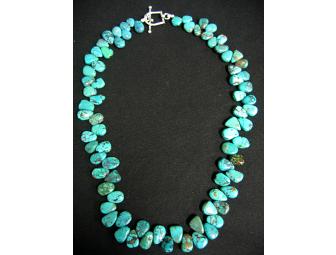 Tear-drop turquoise beads finished off with a sterling silver toggle. Measures 16 1/4".