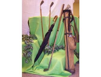 Golf collector? Display this antique set in your office or executive suite. Makes for great conversation!! Includes RGB Co Chicago golf bag, circa 1917; wood shafted clubs: Fairfield mid iron, Thistle midiron, Prestwick forged mashie, Columbia special chromium mid iron, Harry Lee Co hand forged Neptune SS niblick, 8 distance, Scioto chromium forged steel putter, Hunt Wilde Corp ball retriever and umbrella made in England.