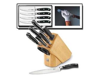 Package includes: A Swiss Army forged Knife Block set, knives include parer, boning, slicer, chef's, bread, and kitchen shears. A set of 4 Swiss Army forged steak knives. A pair of Swiss Army cut-resistant gloves in white, washable, and ambidextrous. Available in sizes XS-XL.