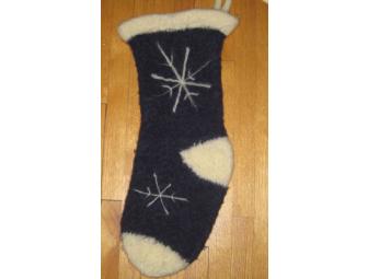 A large, boiled wool Christmas stocking, in blue and white with snowflakes, with a loop for hanging up by the chimney. It has a homespun sturdiness that will serve at least a couple of generations of little ones.
