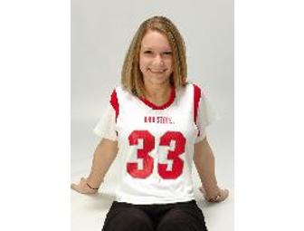 This is for 36 pieces of a ladies football style jersey made of 100% polyester and cotton rib by For the Glory, LLC Garment is white with your choice of color of inset and up to two color imprint. Garment is available small thru xl. Bidding includes shipping.