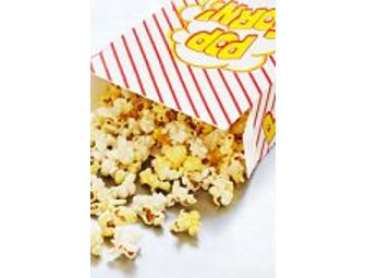 Gourmet popping corn, popcorn boxes, popcorn seasonings, candy and a Blockbuster card for two movies