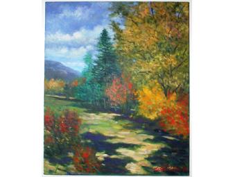 Original oil on canvas painted in 1995 by Nathan P. Hall titled “Autumn Path," a depiction of Acadia National Park located on Mount Desert Island, Maine. It measures 18” x 24”.