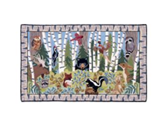 This 100% hand hooked rug measures 3 x 5 and colorfully depicts Maine creatures in their woodland habitat.