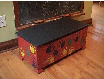 Hand-Painted Wooden Toybox by Ms. Whitney's preschoolers. The top is painted with chalkboard paint. Assisted by: Jen Pramenko, Christi Shinn and Forrest Brown, Susan McBride and Amy Loeffler-Gaw and Greg Gaw