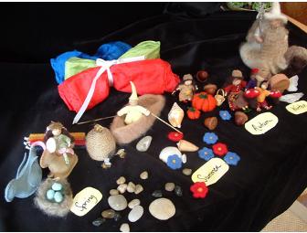 Includes a 7" father winter; 3 inch hare; seasonal silks;acorns, stones, shells, bees wax candles, hives and felted bees,birds nest, row boat, strawberry mushrooms and much more....