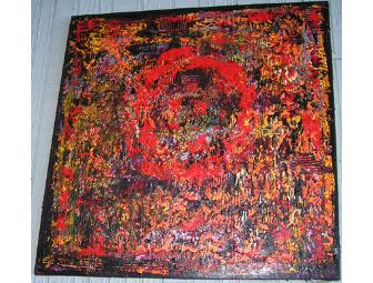 Roscoe Village artist Scot Cousin painted this colorful work called "Ro-Vil," his favorite nickname for Roscoe Village. The painting, for which he used a combined fork and brush technique is a mix of clear acrylic siliconized caulking and acrylic paint. The canvas is 2'x2'.