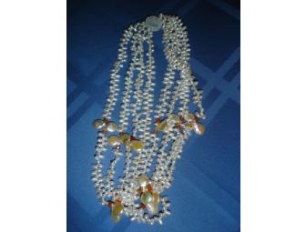 White freshwater pearls with creme color button pearls, carnelian beads and a magnetic clasp.