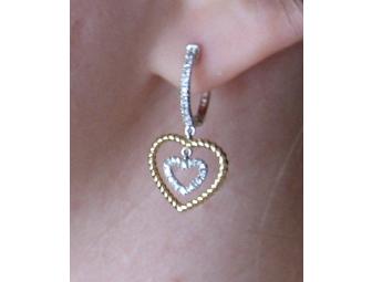 Show your sweetheart how much you care with these beautiful diamond heart earrings! Diamond hoops with yellow gold large hearts, each with a smaller white gold heart. Make your sweetie sparkle!