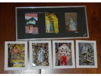This is a framed, matted and titled photo set of 3 photos that comes with a set of 4 greeting cards from Julie Loose's Roscoe Village Birdhouse Series. All photos taken in Roscoe Village.
