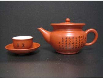Find inner peace with a cup of tea. This beautiful terra cotta tea set includes 2 teapots, 6 cups and saucers, all with distinctive text: