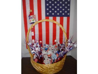 This basket was donated by Mrs. Stevens. It includes many patriotic items (some not shown in photo). Many patriotic beanie babies, patriotic yo-yo, patriotic gliders, notecards, pencils, and 2 American Flags.