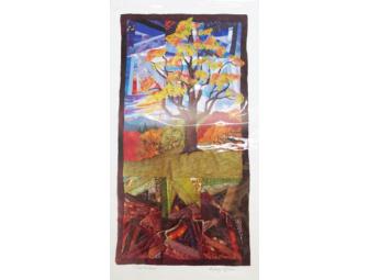 "Vienna Maple" Tree Portrait is the first in a series of Tree Portrait quilts. The tree & landscape are appliqued of various fabrics, their textures, colors & designs suggesting grass, trees & mountains. Hand painted lace, frayed & quilted, creates the uniques autumn foliage of the maple tree. More detailed information about this creative piece is provided. Matted print of a quilted portrait of a tree. Vibrant colors and intriguing design. 22" X 12".