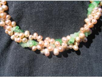 | This triple stand necklace evokes memories of a pink Dogwood tree in spring. It features two strands of oval shaped light pink, genuine pearls entwined with one strand of tumbled and polished Aventurine stones. Pink and pale green delicately melded into a beautiful necklace of twisted gems. The triple strand is 19" long and closes with a sterling silver clasp. |