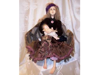 An original, one of a kind, faery Mother and child. Victorian appearing with hand made clothing sitting on a twig bench holding a baby dressed in old lace. 19" tall X 12" across. Date of creation between 1970 & 1989. For more pictures, email kaveril@rochester.rr.com