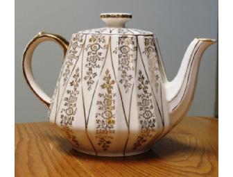 Simply gorgeous gilded teapot from the mid 1900's. Features intricate designs in gold atop an ivory colored base. Just what your grandmother would have used in her tea set. Great accent for any side table or buffet.