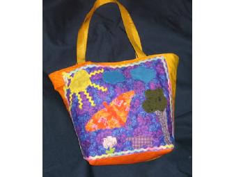 Ms. Fernandez' first graders have designed 6 fabric collage handbags. This bag is lined and has a zipper and phone pocket inside. Assisted by: Sarah Allen and Maritza Castillo