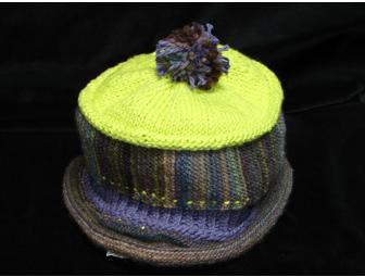 Description: Large hat made of knit and sewn pieces of variegated Japanese wool, vibrant Peruvian cotton, and a bit of wool from a local Summerfield community sheep.