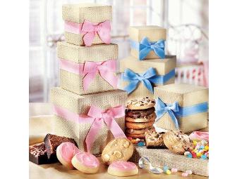 A baby is cause for celebration- and these are just the treats for the occasion. A trio of gift boxes includes eight classic cookies, three brownies, four butter cookies frosted pink, and a half-pound of Jelly Belly? jelly beans.
