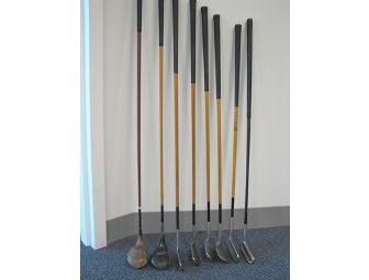 Partial set of Andy Robertson antique, wood shaft, golf clubs: 5 irons, a putter, and 2 woods.
