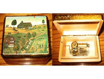 Listen to the beautiful tones of the Swiss musical movement music box as it plays "Song of Weggis". Italian baroque exterior with country village scene on the top. Size: 5"x4"x2"
