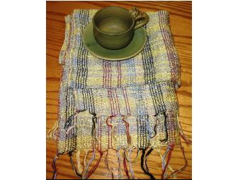 Crimson, buttercup, blush, periwinkle and midnight. These are a few colors woven into this stunning scarf. Long enough to be used as a shawl on cool summer evenings.
