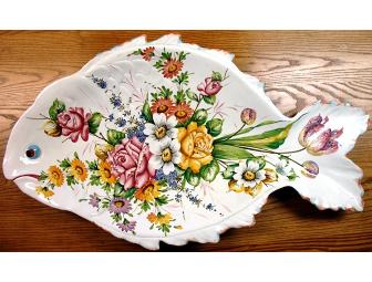ONE OF A KIND DECORATIVE PLATTER. This platter is Italian ceramic and designed to be used as a wall hanging or an hors d'oeuvre platter. The colors are very summery and would compliment any table. What a conversation piece at a cocktail party or luncheon.. The size is 19"wide by 36" long.