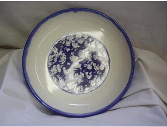 Put this hand-thrown bowl safely in the microwave or diswasher. Made by Normandy Park potter Don Schindler. The bowl is 10" in diameter, 2" high, white inside with wax resist decoration in the center, dark blue outside, wheel-thrown porcelain clay, lead-free glazes, dishwasher and oven safe. However, do not put in oven right out of the refrigerator. The artist suggests also that you not put this casserole in a hot oven - let it warm up with the oven.