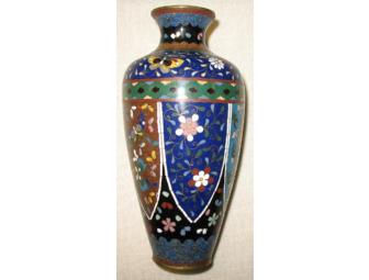 Imagine this stylish 1920's Persian motif cloisonne vase in your home. (7 inches tall, brass lined)