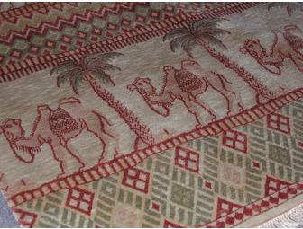 This beautiful rug measures approximately four feet wide by six feet long and features an exotic camel and plam tree motif.