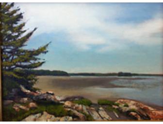 Prentiss studied oil painting at Maine College of Art. Her work has been in many New England galleries, including Bayview Gallery. As primarily a plein air painter, she uses a limited palette with brush and painting knife to achieve rich pure colors and textures in her work. She feels joy being in nature and hopes, through paint, she can convey some of what she experiences. Recently, Prentiss has been creating landscapes on commission, finding particular pleasure in exploring personal views of others to incorporate into a painting. Painting is 12 x 16 oil on linen - chart on back shows location in Mere Point Bay.
