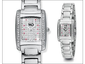 Delicate ruby crystal accents add just the right touch to this pave Swarovski silver colored dial. The splash of color distinguishes this watch while maintaining a classic look and feel. The bracelet is 7 1/2 inches and can be resized by a jeweler.