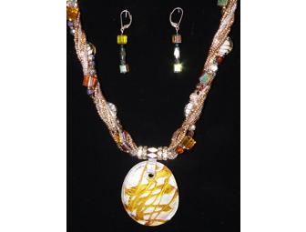 Venetian Crystal 16 inch choker contains multi strands of gold and cream crystal beads with a large gold and cream colored Venetian crystal oval pendant. The necklace has coordinating 1 inch earrings.
