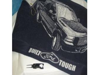 Built Ford Tough Golf Towel picturing Super Duty and push button automatic open divot tool with Ford ball marker.