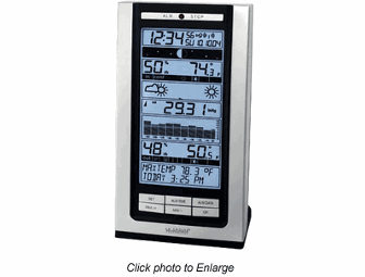• Wireless sensors report outdoor conditions on huge, backlit LCD display