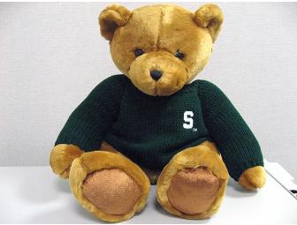 My name is Beaumont Bear. Call me Beau. Everyone knows me by my bright green knit sweater with the letter S--for State or Michigan State University. You will find out that I am very soft and easy to cuddle. I am #831 our of 1000 part of a limited edition!