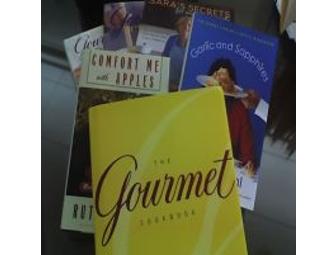 This collection of 6 cookbooks includes "The Gourmet Cookbook" written and signed by Ruth Reichl; "Sara's Secrets for Weeknight Meals" by Sara Moulton; "Garlic and Sapphires" by Ruth Reichl; "Comfort Me with Apples" by Ruth Reichl; "Gourmet's Five Ingredients" and "Gournet Every Day"