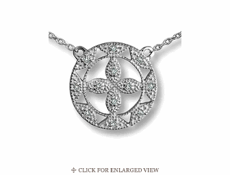 This original design is a 14K white gold pendant with 12 diamonds, eight carefully placed around the circle and one on each of the four extensions of the inset leaf.