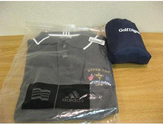 Men's XL Golf Digest's Bag Jacket - Classic Anorak Pullover w/ hood & XL Ryder Cup Oakland Hills short sleeve Dark gray golf shirt with white trim.