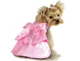 This elegant dress from Pampered Pets is made from a silky poly blend & constructed of three individual layers for volume & form. The attention to detail continues with a beautiful flower pattern & trim that is meticulously hand sewn. Sophisticated pearl ribbon on the back is detachable. Metal snaps up front for durability & easy access. Available in size: Large Fits: (Length 11” – 13.5”) (Chest 15.5” – 17.5”)