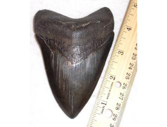 This shark makes "JAWS" look like a minnow. The Megalodon Shark was a ancient shark that grew to around sixty feet long, it has been extinct for over a million years. This actual Megalodon Shark Tooth is 4-5/8 inches long by 3-1/8 inches wide. It is approximately 4-7 million years old. A fossil this rare is certainly a collectors item for anyone interested in fishing or fossils!