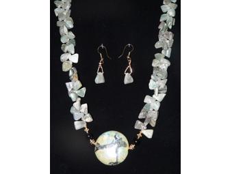 Beautiful moss agate and onyx beads with 14K gold filled findings, showcase this beautiful Kazuri Center pendant and matching earrings. Necklace is 20 inches.