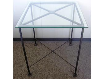 This beautiful custom-made iron side table with glass top would be a lovely addition to any decor. This table is not available in any retail store. It is handmade by a local ironworks shop called Iron Accents, Inc. This exclusive Houston craftsman only makes custom designed iron furniture for interior designers and decorators.