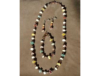 Earthy colors mixed with copper spacers and clear rondelles create a casual yet sophisticated 22" necklace. Matching 7.5" bracelet & earrings are included, creating an artistic trio. The essence of Deb Rich's artistic expression is revealed in each lampwork bead that she creates in her studio. Deb's beads exhibit her desire to create and inspire change through community outreach. These pieces are offered exclusively through cMarket to support the fundraising efforts of non-profit organizations. Lampwork glass reflects both the heartfelt passion and interpretative expression of Deb Rich. Her artistic resume includes fantasy sculptures, creatively fashioned from found-objects and recycled materials. "The art of lampworking has a Zen effect," says Deb, "serving to calm and focus the artist and the viewer, enchanting both with the beauty of this molten solid." Indeed, Deb's Glass Designs are truly hypnotic, one-of-a-kind pieces that cannot be replicated or manufactured by a machine. Deb only sells pieces that capture the grace and flow of glass artistry. All jewelry is made with sterling silver or copper findings, Czech or Swarovski Crystals, and various complementary beads, making Deb's Glass Designs positively the best choice.