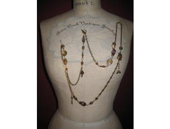 From a luscious collection of antique baubles (including Venetian glass beads), buttons, cufflinks, watch fob parts and charms, Anne Cook Vintique Jewelry has created this 46" opera length necklace, combining vintage trinkets to complete an object d'art. Offering unique versatility and playfully showcasing an array of antique components depending on the way it is worn: #1 - once around at the opera length #2 - doubles to matinee length #3 - tripled as a collarette