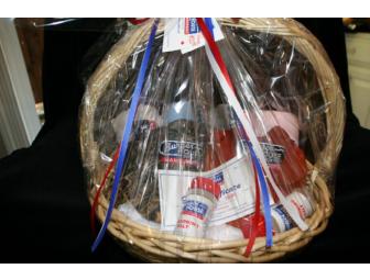 Burger House gift basket containing hats, t-shirts, spices and gift certificate