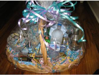 This Basket will start the fun: Grey Goose, Martini Shaker, Martini Accessories, 4 martini glasses, stirrers, 2 sets of cocktail napkins, and 2 votive candles.