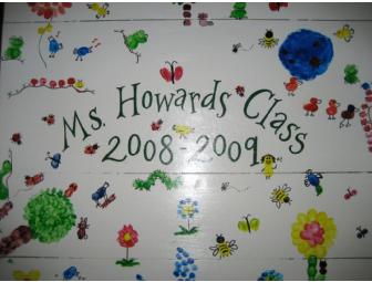 This antique wood table was painted with a garden bug theme by all the students of Ms. Howards' Class. On the lower platform, each student left a thumb print with his/her name. The table is a fantastic keepsake!